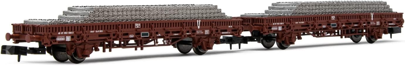 Ce coffret Arnold (Réf. HN6543) est l'ajout parfait pour donner vie à un train de travaux sur votre réseau à l'échelle N. Il contient deux wagons plats à ridelles (souvent des anciens wagons ex-US) avec un chargement réaliste de **traverses de béton**, essentiels pour la maintenance des voies de la **SNCF**.