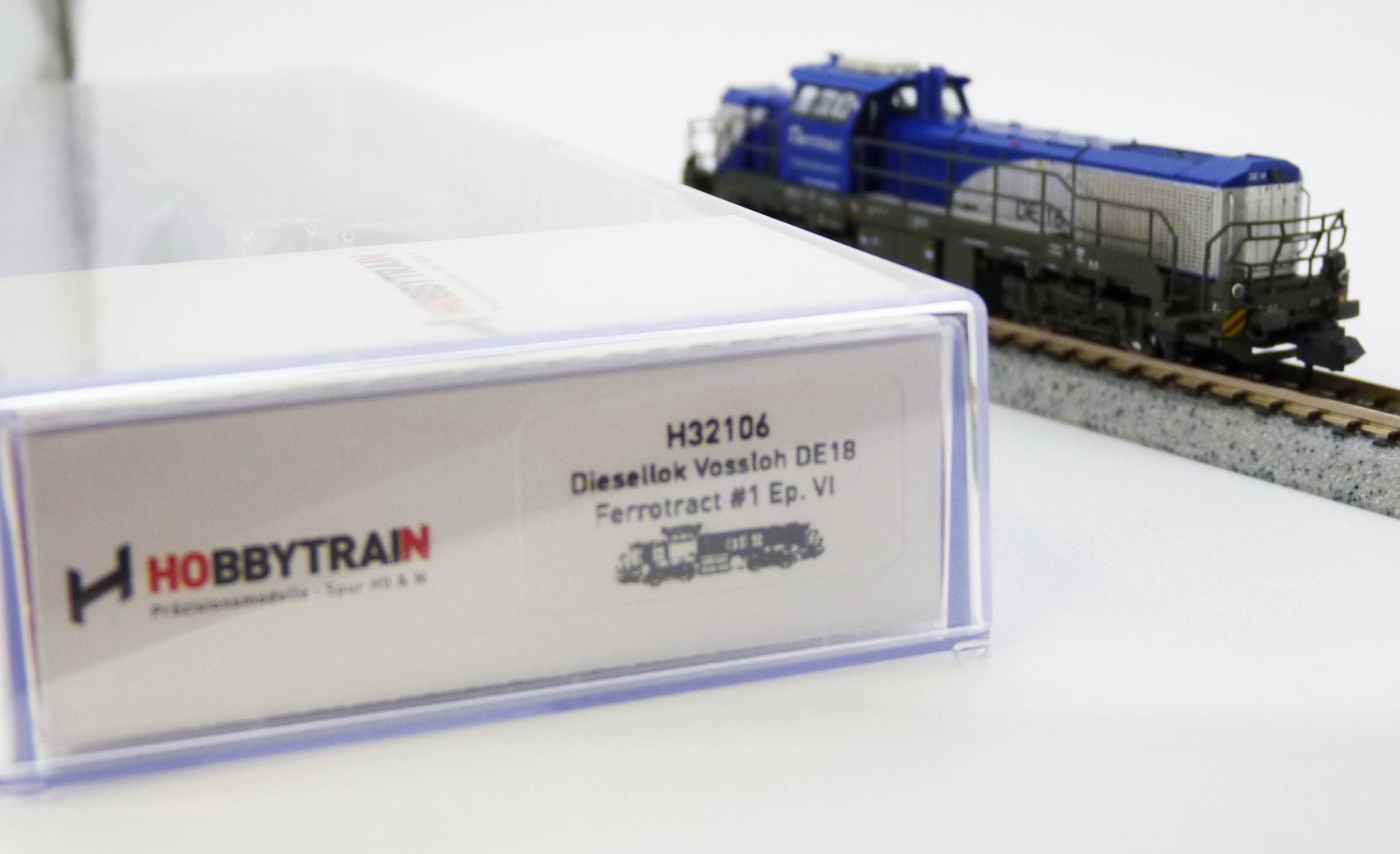 Ce modèle Hobbytrain (Réf. H32106) est une reproduction à l'échelle N de la locomotive diesel **Vossloh DE18 N°004-6**, arborant la livrée sobre et moderne de l'opérateur **FERROTRACT**. C'est une machine puissante et polyvalente, typique du fret ferroviaire de l'Époque VI en France.